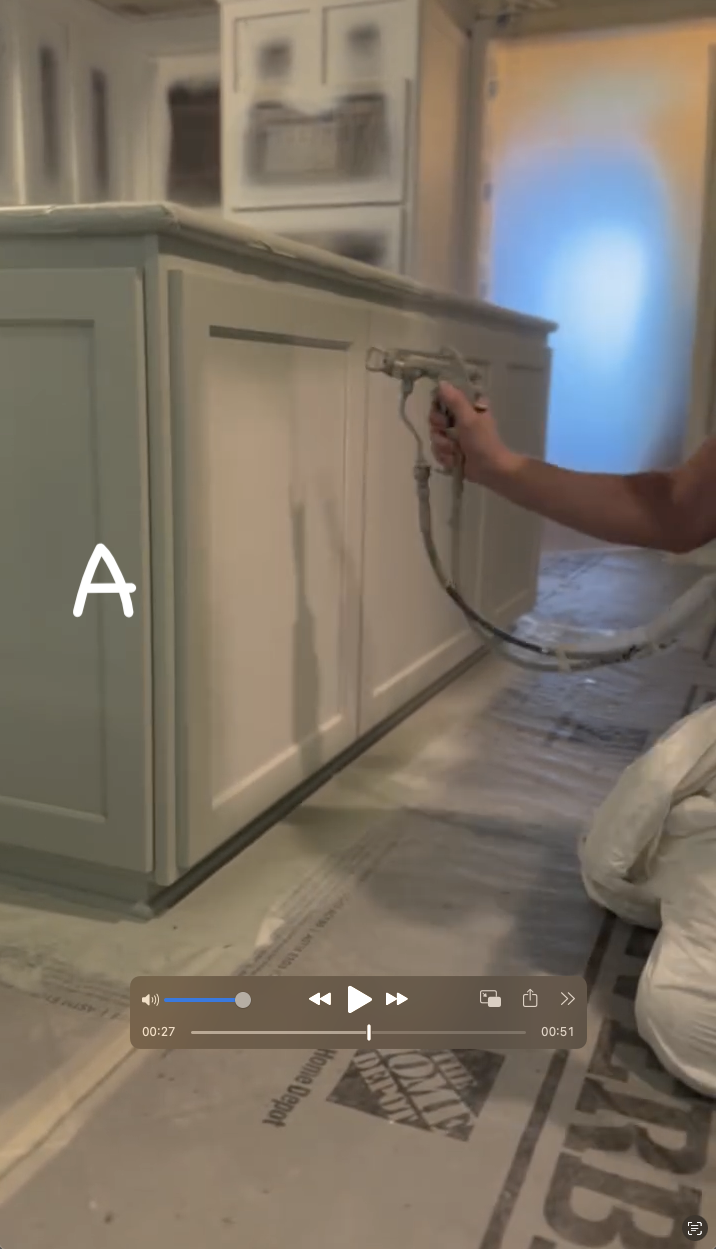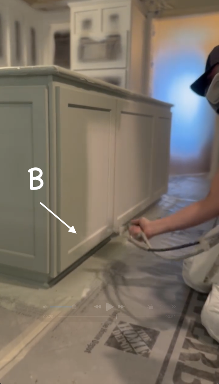 To avoid confusion, in this scenario—kneeling—I would be holding the gun vertically with the hose pointing to the floor, as seen in photo A. The difference would be the positioning of the guard. I would position the guard opposite what you see in A. This finisher held the spray gun horizontal for most of this island, as seen in B. I never spray like that because of articulation limits.