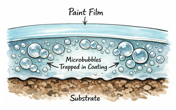 2. **Immobility and trapping.** Because microbubbles are so small, they rise through viscous paint much slower than the coating cures. They therefore become permanently trapped beneath the surface. The resulting small cavities create weak points that may later become blisters if moisture or solvent vapors accumulate under the cured film.